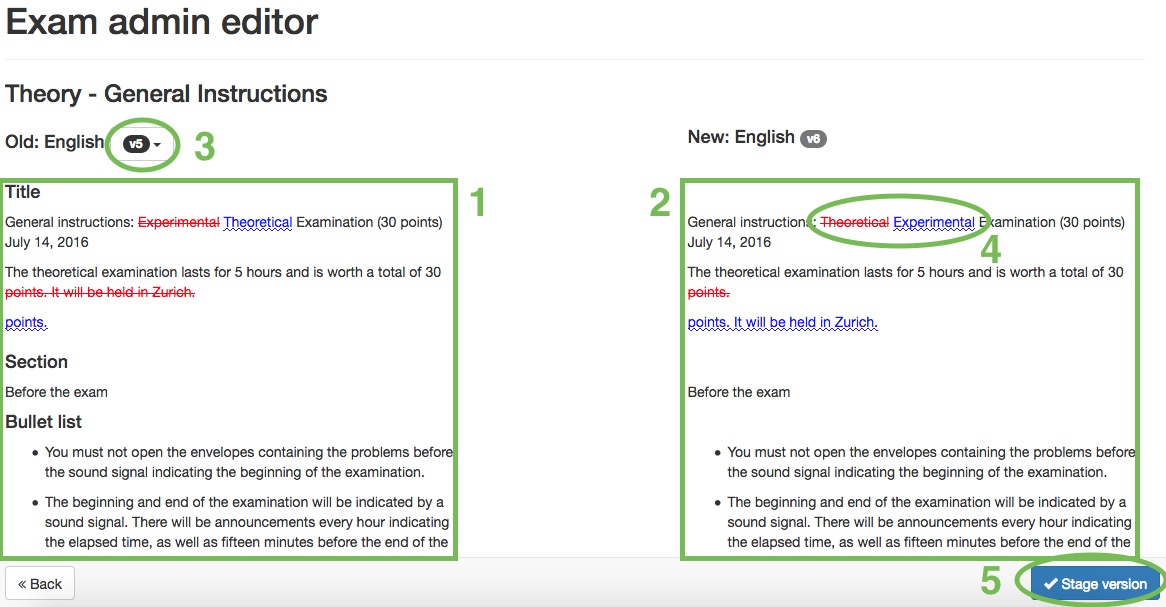 - 5 - Stage version, by clicking here the version is accepted and will show up with status staged in the exam management. This is still not visible to the delegations. To make it visible, all staged versions can be published in the exam management.